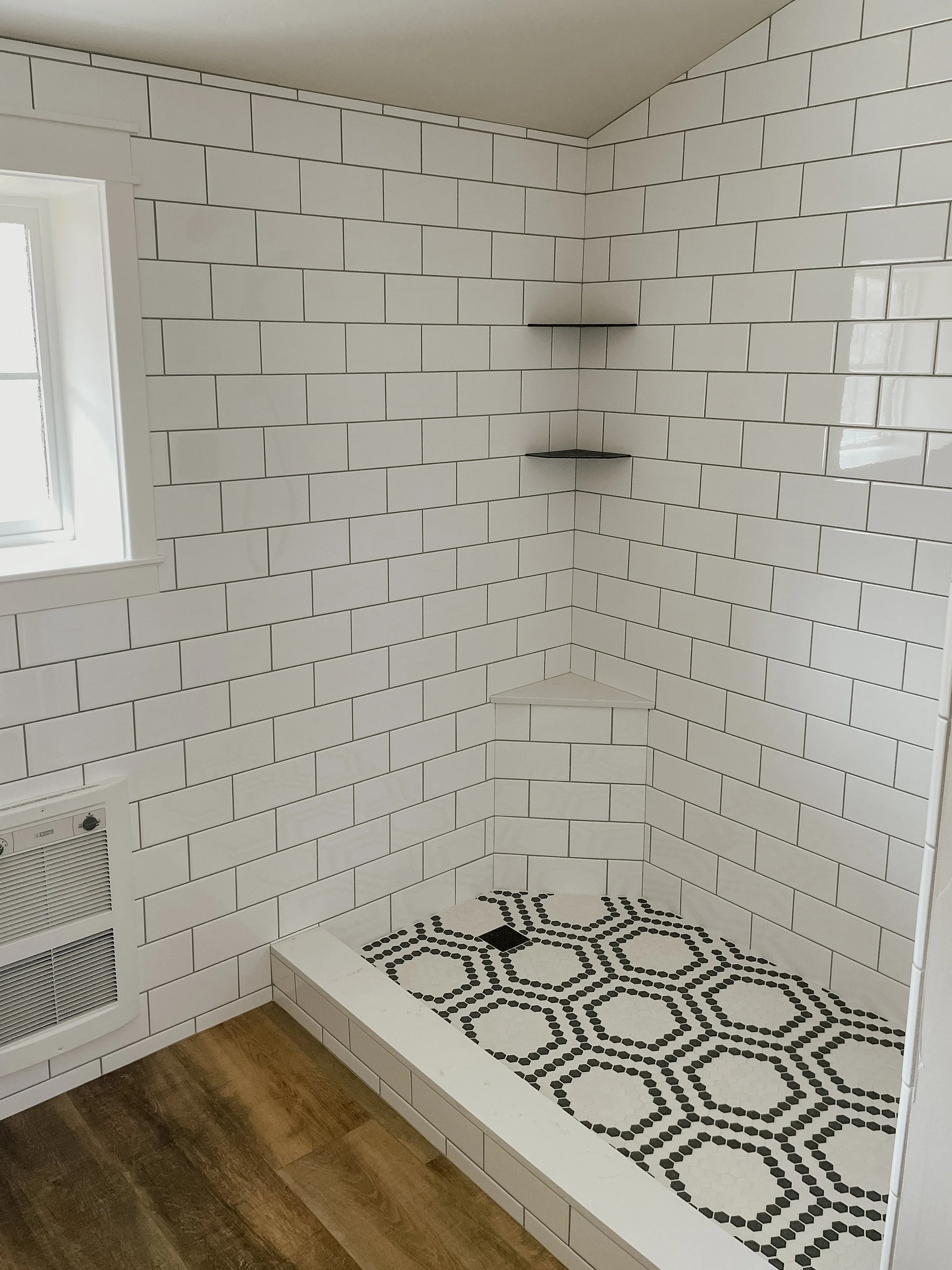 Bath and shower wall tile, inside shower shelves and shower floor with hex tiles.
